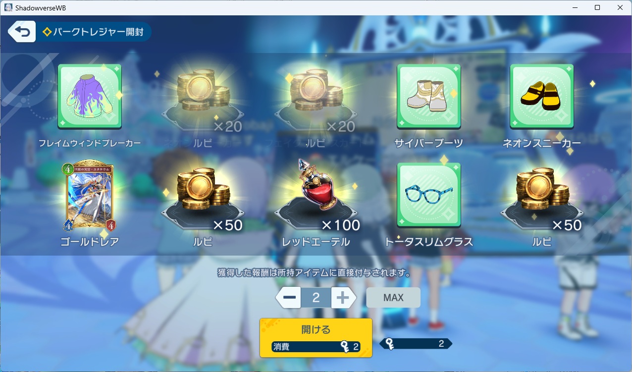 パークの真ん中にある宝箱。10連でルピ200+エーテル100+レジェンドとかもたまに当たる感じ。重複した装備品はルピに変換してくれる。