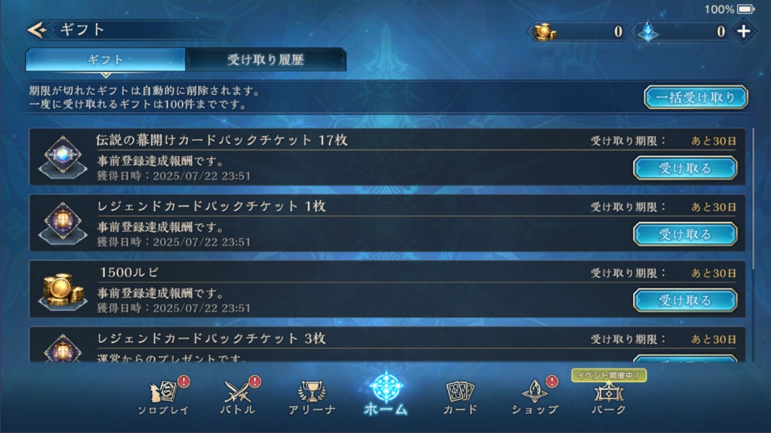 リリース当初に配布していた大量パックとエーテルは既に手に入らなくなっていた。2025年7月現在はカードパック19回、レジェンドパック3回、ルピ1500が初期配布のようだ。