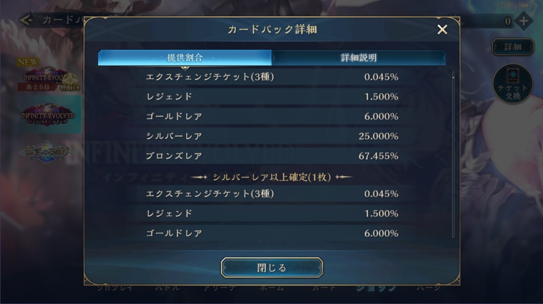 レジェンド4枚重複するのは大変なので計算から除外する。金銀銅のカードをコンプリートしてる場合、1パックで得られるエーテルは200程度。金銀銅全3枚ずつ所持には183枚=23パック開ける必要がある。
