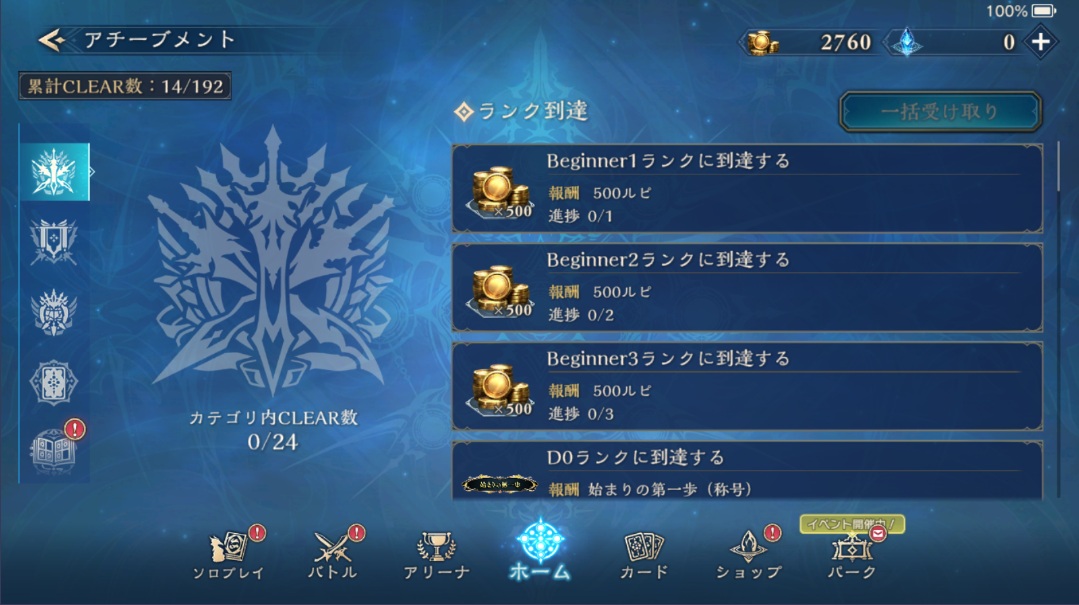報酬は1回しかもらえない。期間限定報酬は今の所無い。対戦系の報酬が多いので達成するのは結構大変。