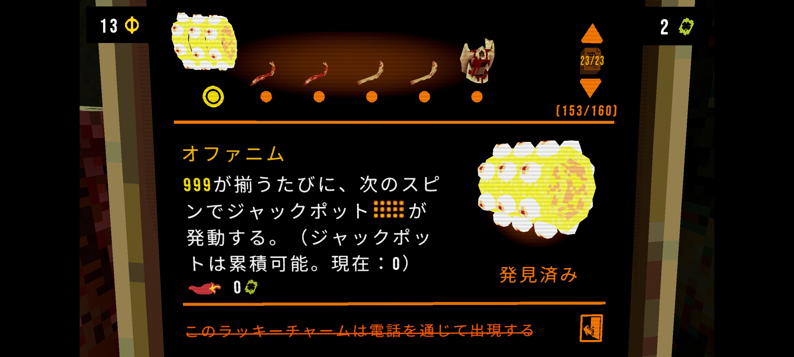 オファニムという聖なるラッキーチャームは、999が揃った後のスピンにジャックポットを付与するチャームである。この効果を擬似的に再現するのが擬似オファニムビルド。使用方法は残り2スピンの時(核ボタンがチャームに存在する場合は残り3スピン)かつ取り憑かれた携帯電話のボタンチャージが最大の時に赤ボタンを押すだけ。残り2スピン時(核ボタンがあるなら3スピン時も)に666が揃ったと同時に次のスピン時に悪魔の角による運気+10が付与され、最後の残り1スピン時に逆さハムサの運気+7が発動、合計運気は+17に到達、無事+15を超えるので3×5の盤面上全てに運気効果で1つの図柄だけが確定し、結果的にジャックポットが確定する、という999(666)が揃った直後にジャックポットが確定するオファニムと同じような効果が再現できるというメカニズム。強みは、オファニムにはないメリットとして999(666)が揃うという条件を赤ボタンによって自力で満たせる点と、666であっても効果が発生する点(コラッそこ、そもそも666の時点ではオファニムは手に入らないだろJKとか言わないで。)と確定ジャックポットによる高配当。666を敢えて確定発動させてからコインを稼げる利点は、セイクリッドルートの条件に上手く噛み合っており、セイクリッドルートによるクリアを容易に出来るのも大きな強みとなっている。弱点はセイクリッドルート条件である白い電話を受け取っていない場合は666によりコインを失う点と、オファニムとは異なり3チャームスペースを消費する点、他には弱点ではないがオファニムとは異なり最後の3~2スピン時でないと効果が正しく発動しない点。後者の弱点と違いは他のチャームで効果を再現する都合上仕方ない点もある。だが、このビルドを流用する事で後述のバフォメット型666ビルドを大きく強化できるようになる…。
