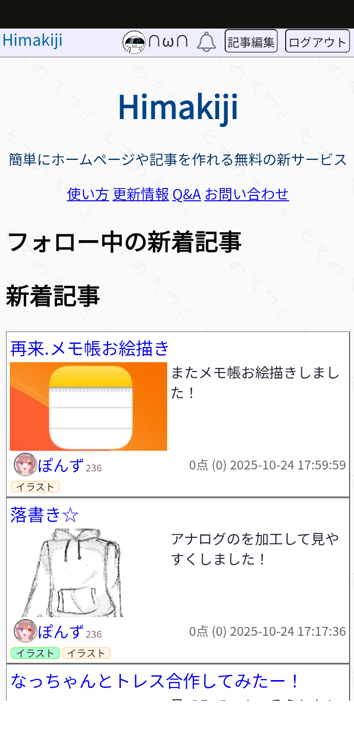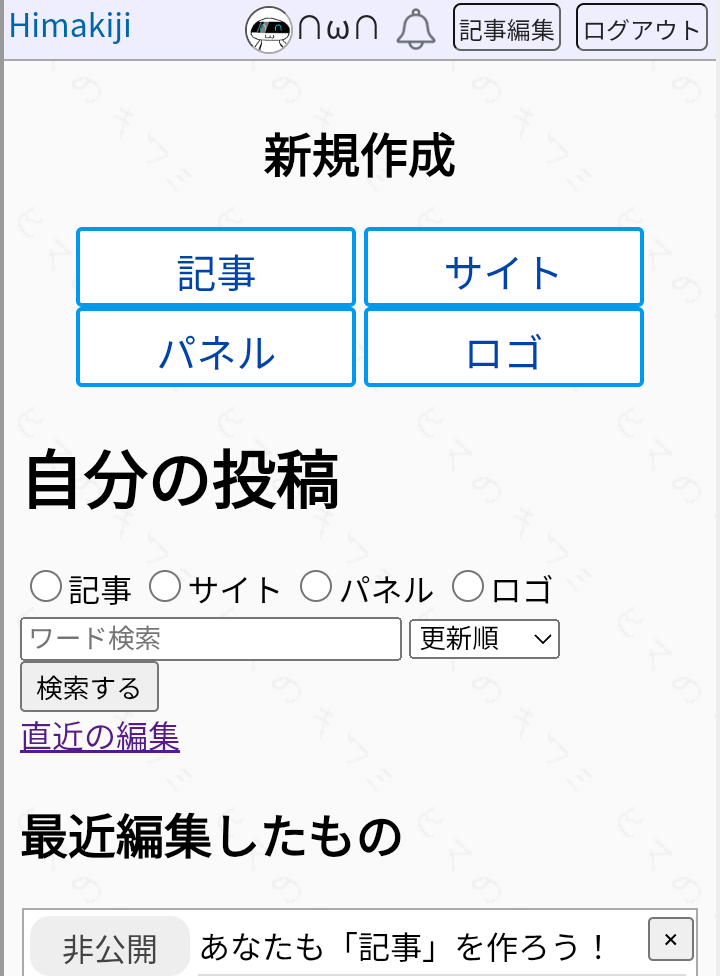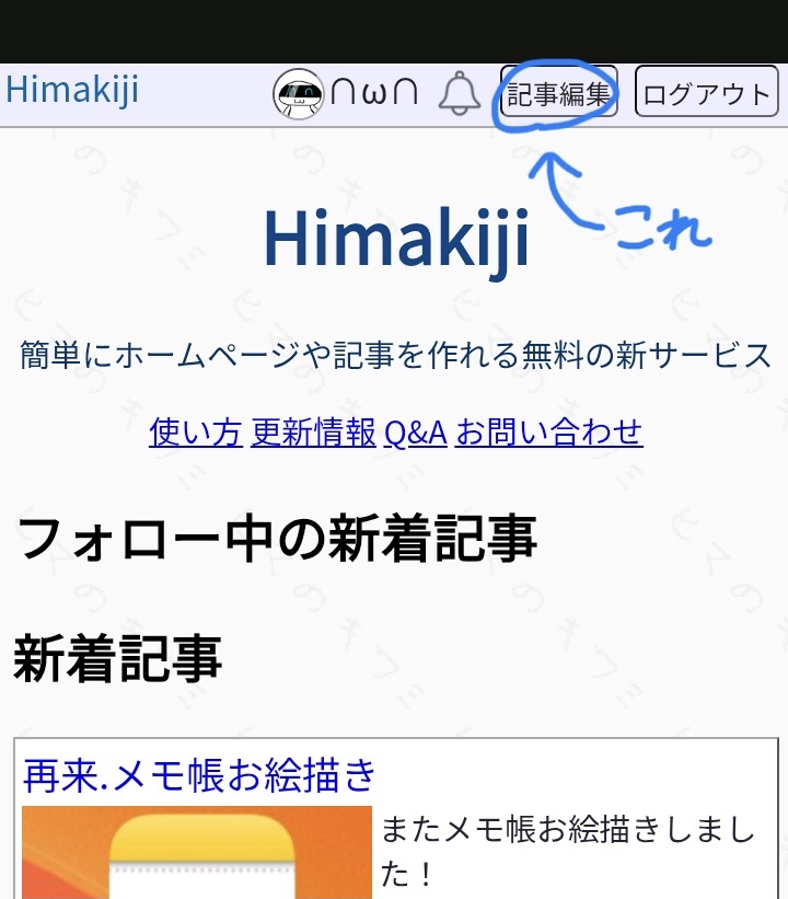まずはログインして画面上部にアカウント名が表示されていることを確認しよう。左上に「記事編集」と書かれた部分があるのでそこをタップする。