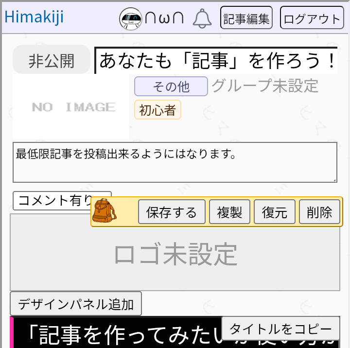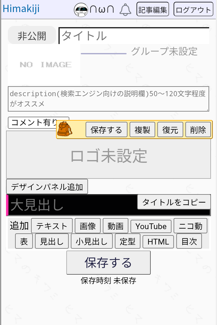 「保存する」は記事の状態をセーブ、『複製』は選択している要素を直接複製、『復元』は一つ前に削除した要素を復元(最後に削除した要素のみを復元する)、『削除』は選択した状態の要素を削除する。(詳しくは後で)