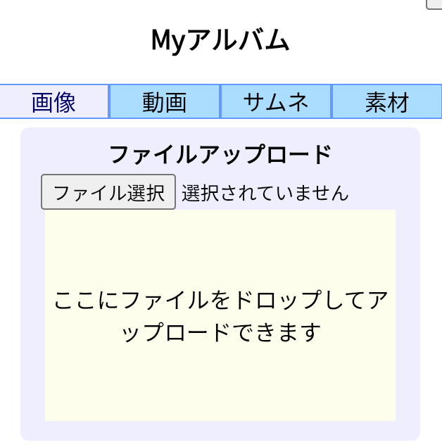 このような表示が現れるのでファイル選択を押して添付したい画像・動画を入れよう。「サムネ」「素材」は特に関係ない。ファイルのドロップはPCやタブレットで使用できる。ファイルを選択するとアップロードに移行する。動画は少しアップロードが遅い場合がある。