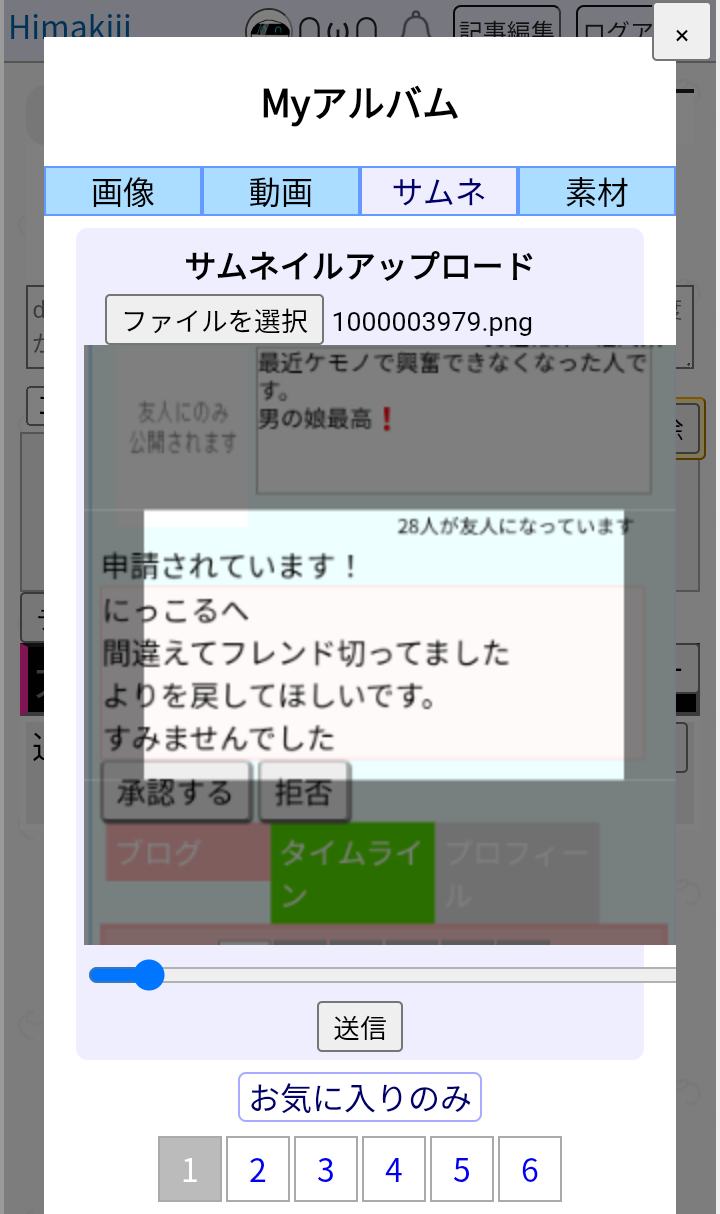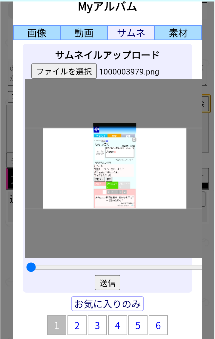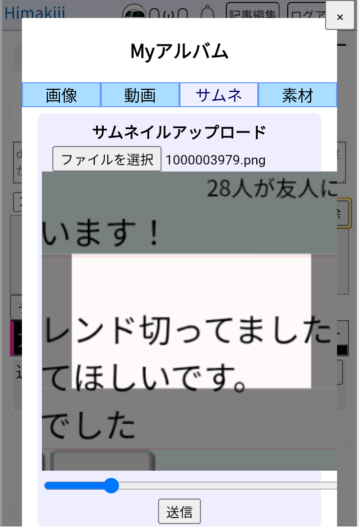丁度いい大きさに切り抜くことができたら、下の送信を押してアップロードしよう。あとは画像と同じくアップロードした画像をタップすればサムネに設定できる。