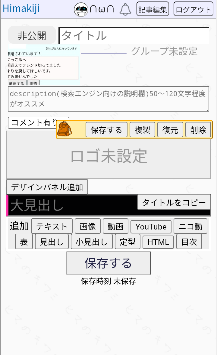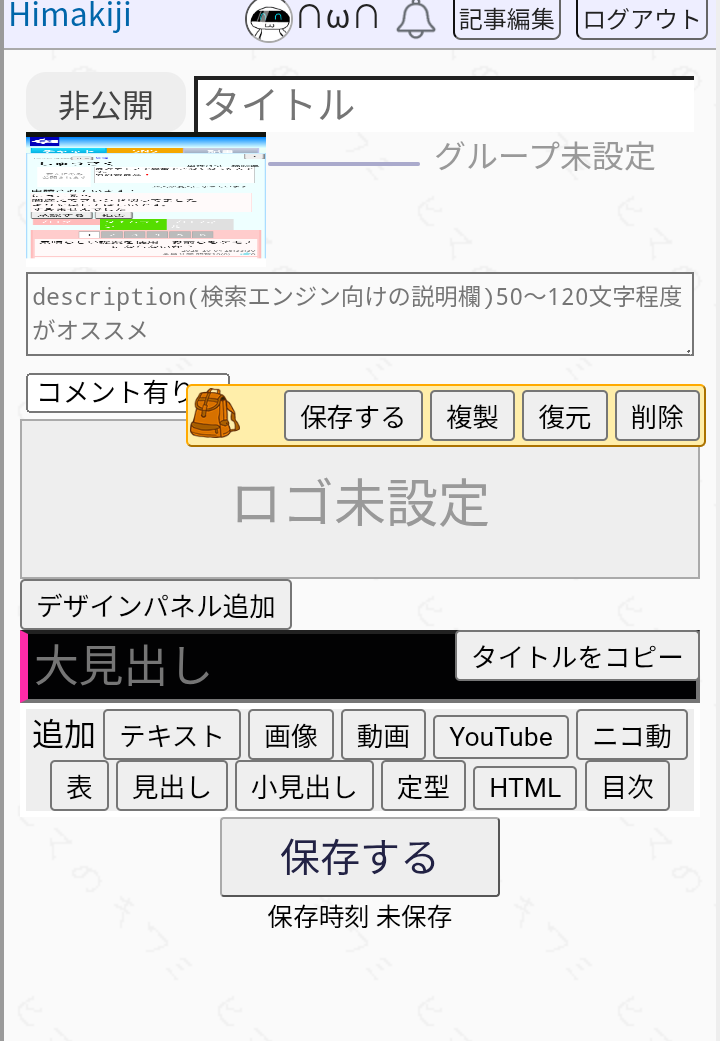 「記事」をタップすると次のような画面が出てくる。初めは戸惑うかもしれないが、後で解説するので、まずはタイトル部分に適当な言葉を入れて「保存する」を押そう。これで一旦土台は完成である。