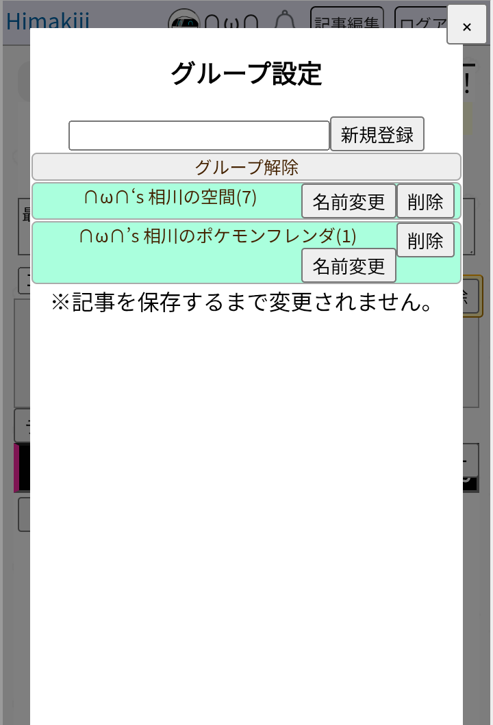 「グループ未設定」と書いてある部分から設定できる。個人のユーザーが作るグループにまとめることができる。例えば、私のグループは「∩ω∩‘s 相川の空間」と「∩ω∩‘s 相川のポケモンフレンダ」の2つがある。