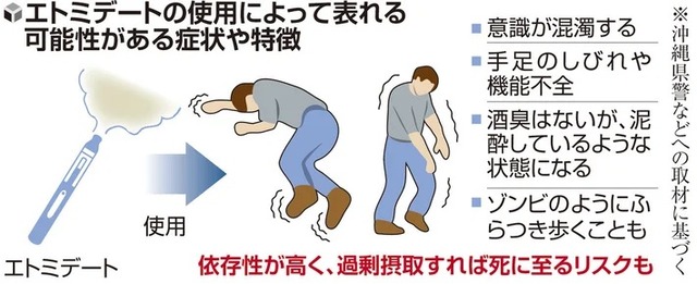 ゾンビたばこは、過剰摂取すると手足がけいれんしたり、意識を失ったりする場合がある。若年層に乱用が広がりつつあり、捜査当局が全国で警戒を強めている。