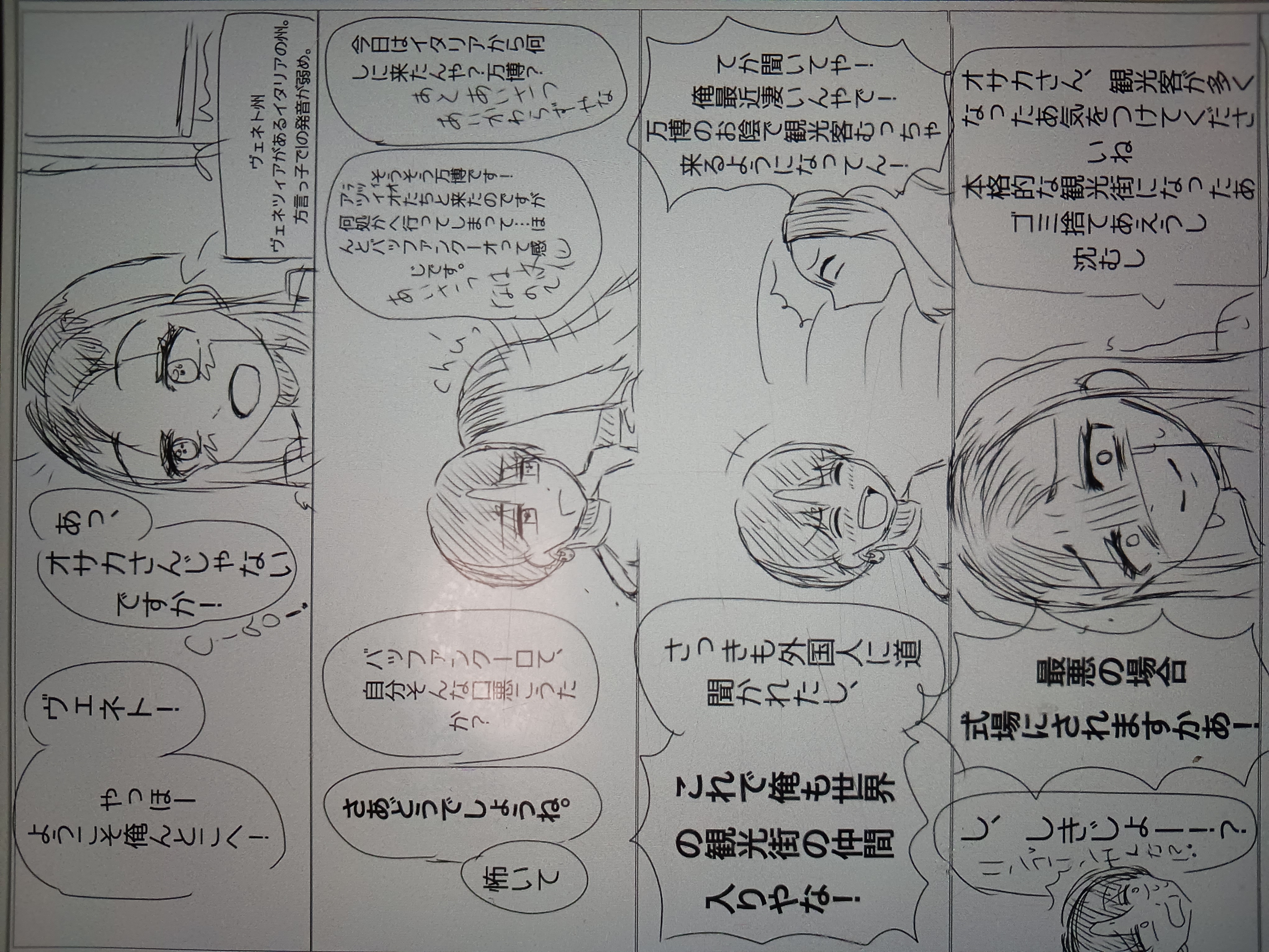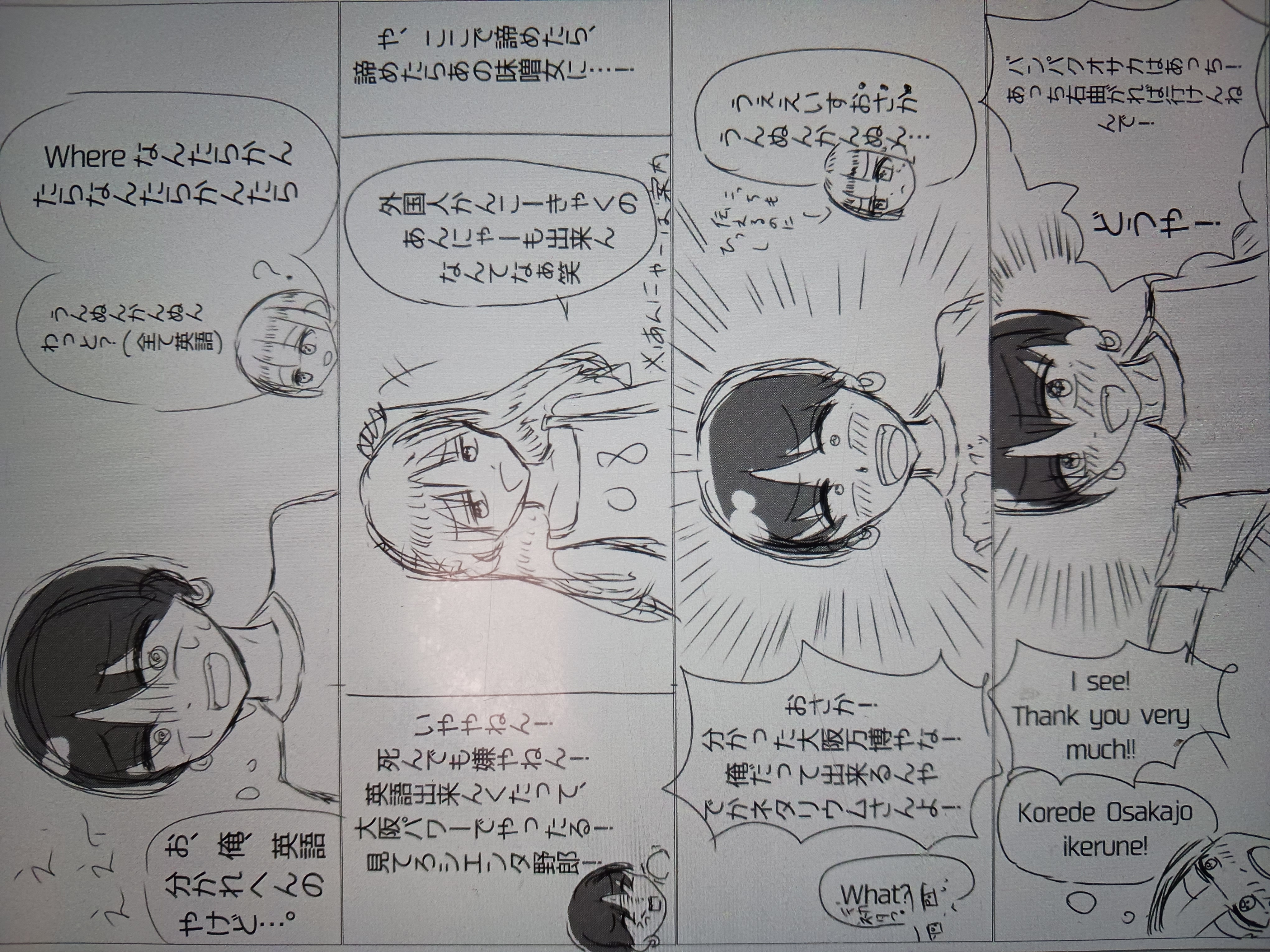 かなり前にケンミンショー見てて、外国人観光客の案内を英語分からないなりに頑張る大阪人が可愛くて描いてしまいました。