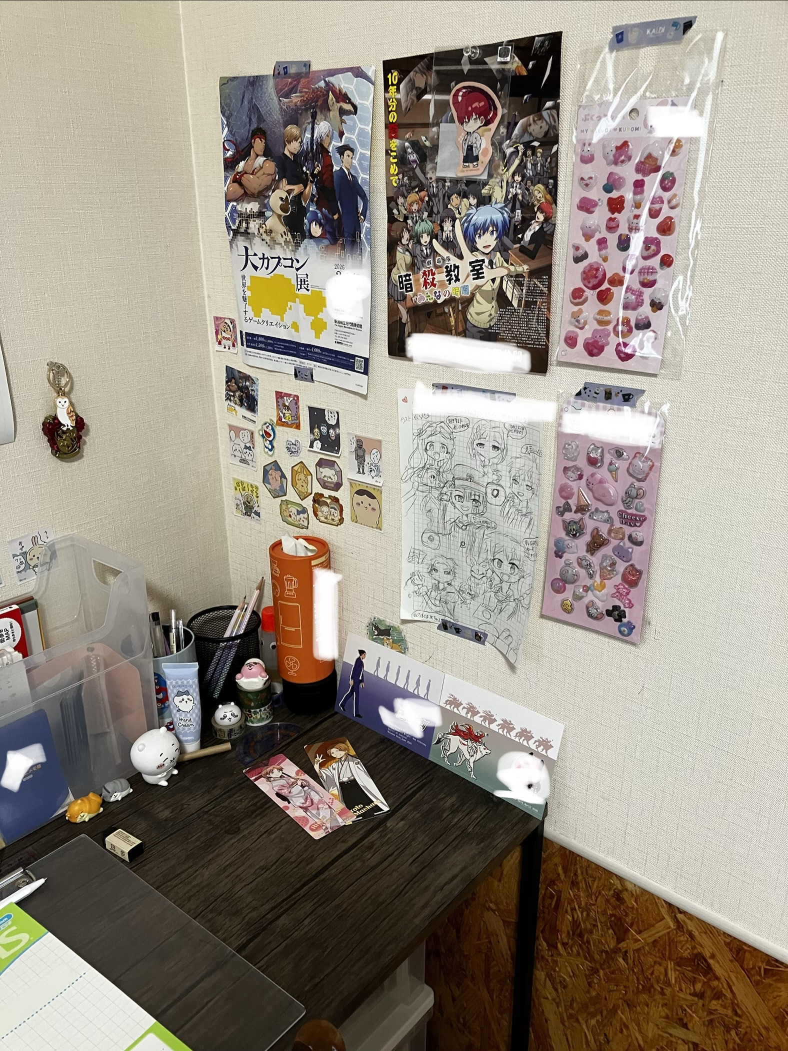 こちらデス、好きなものをつめつめにした机!あーー😩なんかごめんなさいね、汚い机を公開してしまって、シールがめっちゃくっちゃ貼られております。