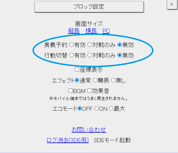 ②丸で囲っている部分を「無効」か「対戦のみ」にしておきましょう。