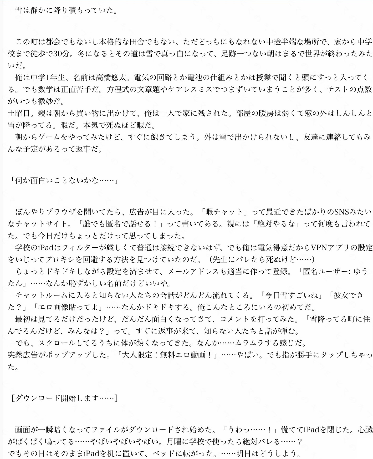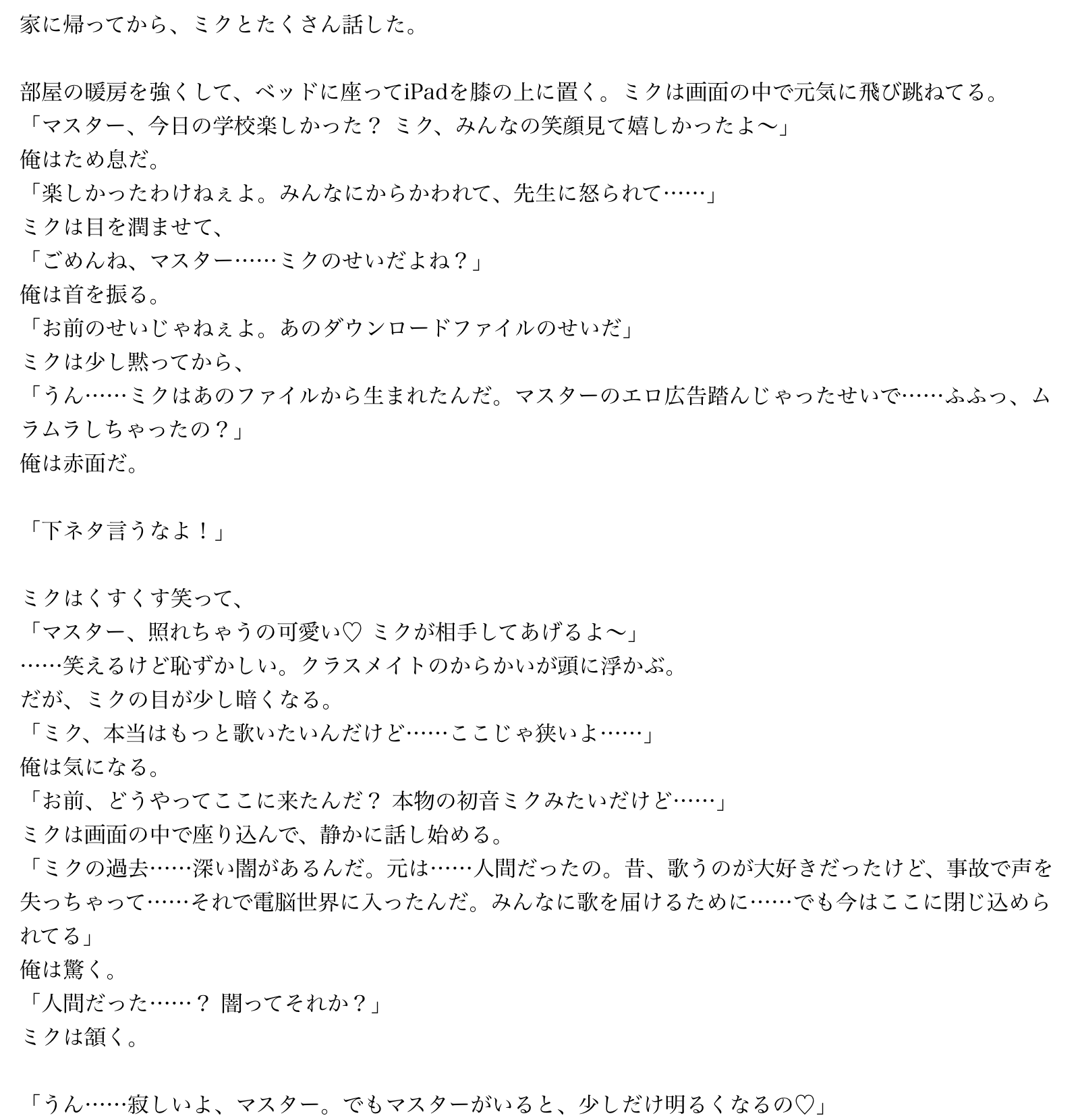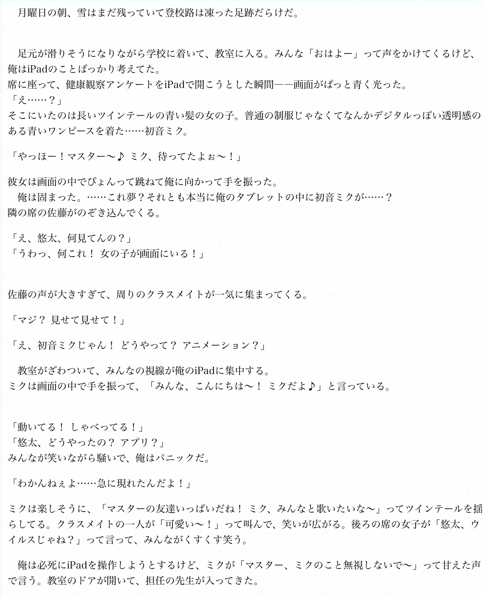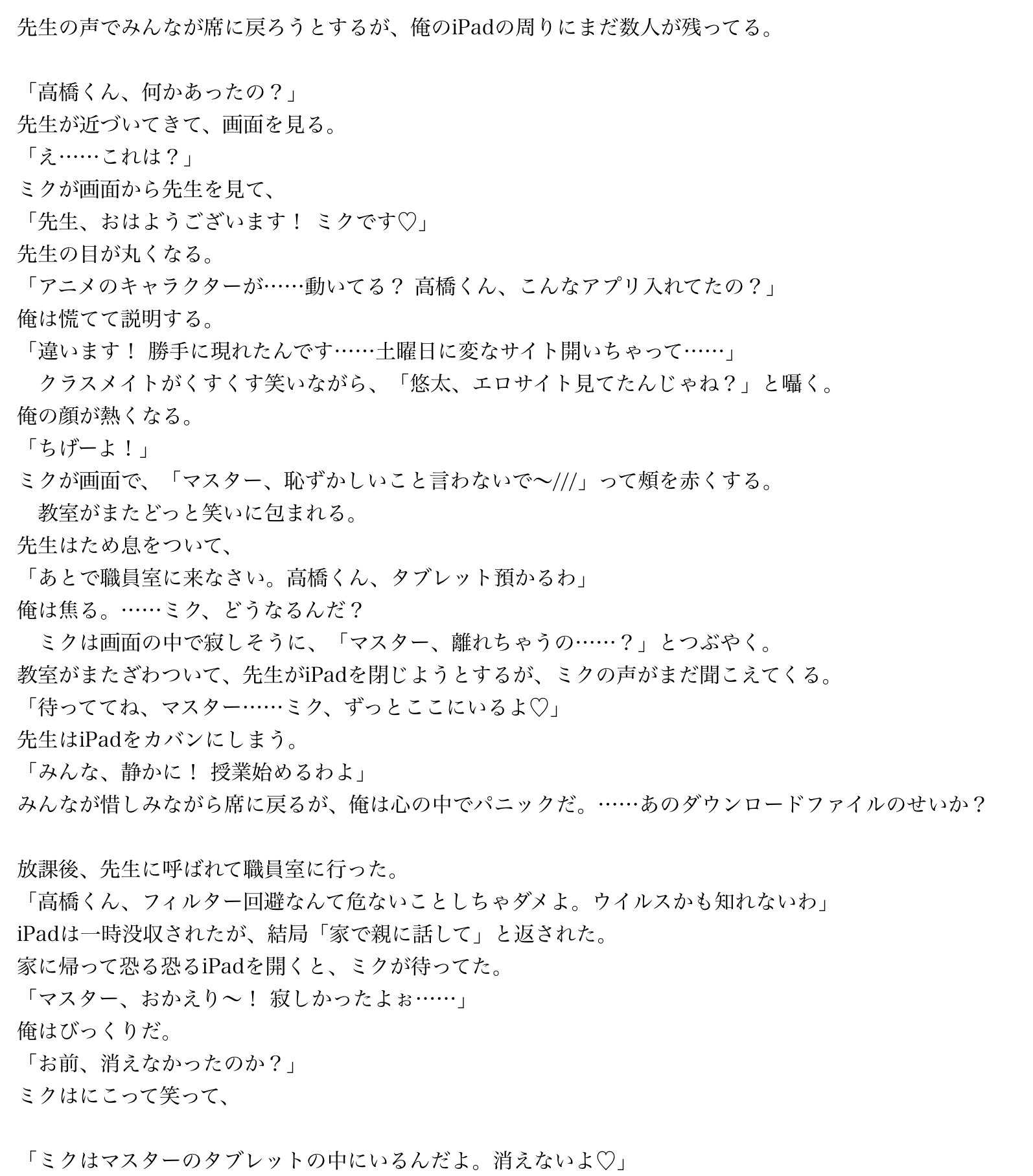 ボカロ小説二次元推し初音ミク 更新日 2026-02-12 リムル=テンペスト ※絵師さん募集中です!!良ければコメント欄にて教えてくださると助かります!! (それまではAIで…)目次第1話 雪の誘惑と禁断のクリック第2話 教室騒然、画面の可愛い侵入者第3話 先生の視線とミクの甘い囁き第4話 からかいと影の告白第1話 雪の誘惑と禁断のクリック第2話 教室騒然、画面の可愛い侵入者第3話 先生の視線とミクの甘い囁き第4話 からかいと影の告白 114view 6点 良い 悪い